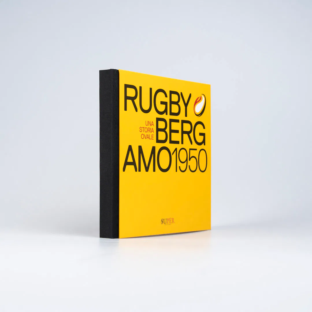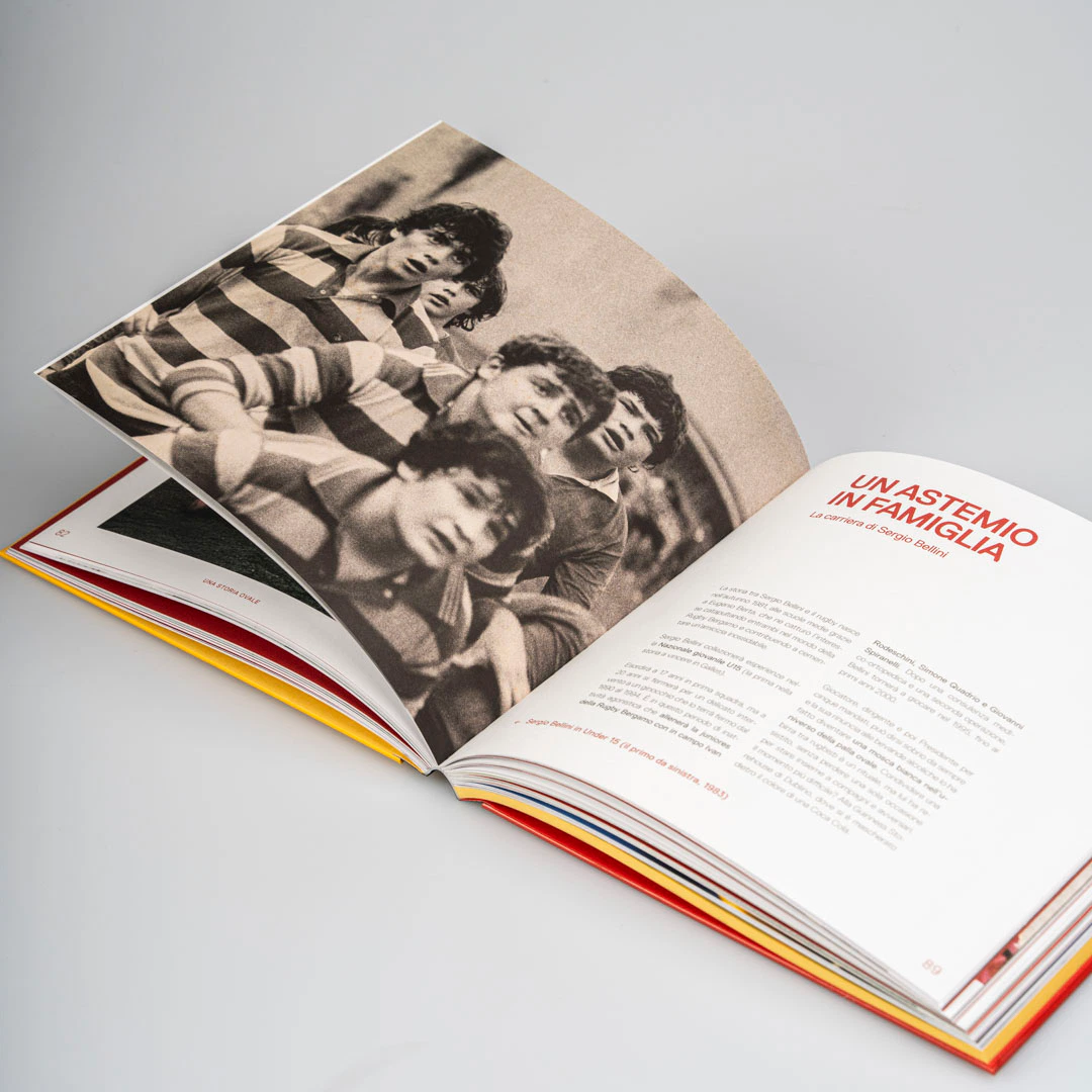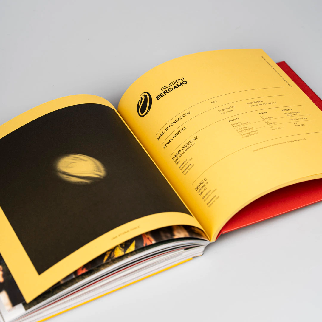 La scelta della copertina cartonata con rilegatura bodoniana definisce fin da subito il carattere di un oggetto compatto e solido, proprio come il fisico di un giocatore di rugby. Il giallo e il rosso richiamano i colori della città di Bergamo e della società, mentre la carta usomano, porosa e materica, e i risguardi colorati in pasta costruiscono un’esperienza tattile più pregiata da quella dei libri tradizionali.