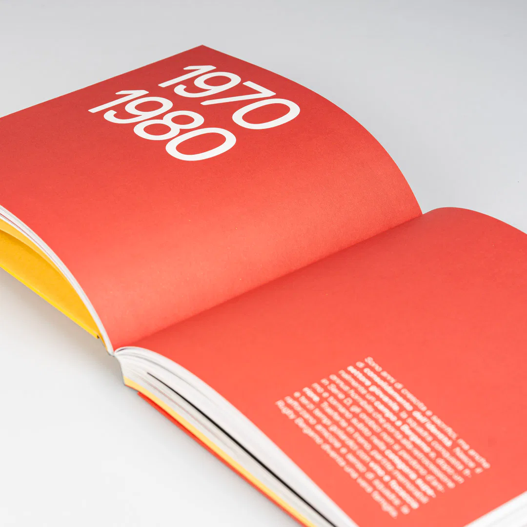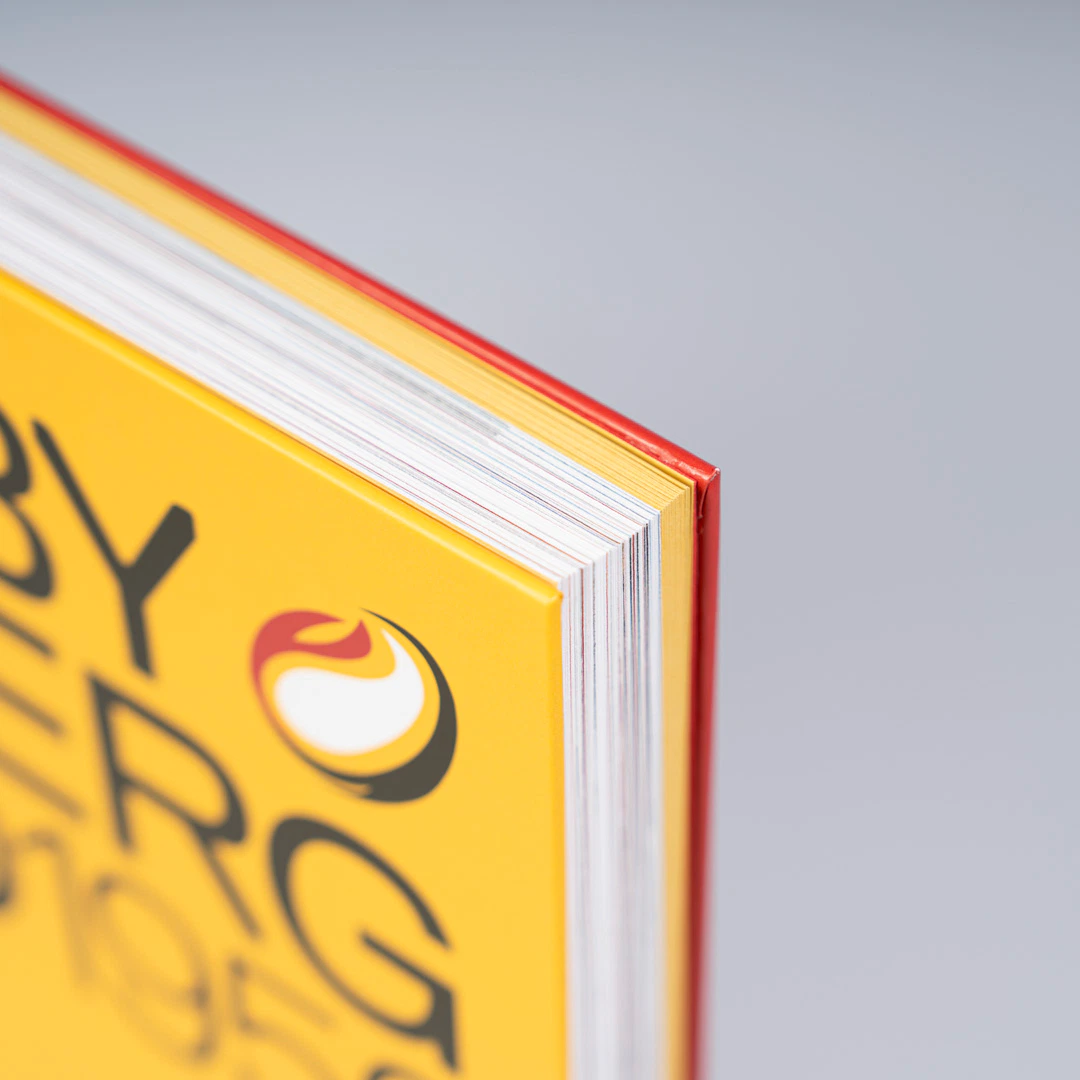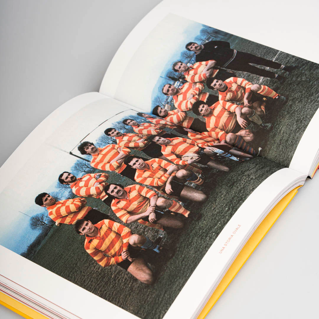 La scelta della copertina cartonata con rilegatura bodoniana definisce fin da subito il carattere di un oggetto compatto e solido, proprio come il fisico di un giocatore di rugby. Il giallo e il rosso richiamano i colori della città di Bergamo e della società, mentre la carta usomano, porosa e materica, e i risguardi colorati in pasta costruiscono un’esperienza tattile più pregiata da quella dei libri tradizionali.